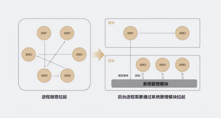 图片描述:相比 Android 可被随意拉起的 FA 模型(左侧),具备前后台解耦能力,且由系统管理模块才能拉起后台进程的鸿蒙 Stage 模型(右侧),在系统资源管理方面有着更为出色的表现。